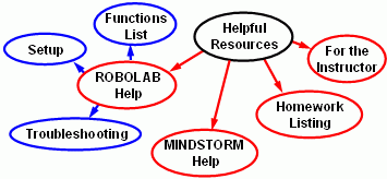 If you have never used Robolab before, or it is not installed on your computer, then start with the blue Setup bubble under "Helpful Resources" > "ROBOLAB Help." Once your software and hardware are set up, the diagram below is the place to go. Consider it to be a Table of Contents in graphical form. When you have completed the course, please fill out this evaluation form and hand it in to your teacher. |
